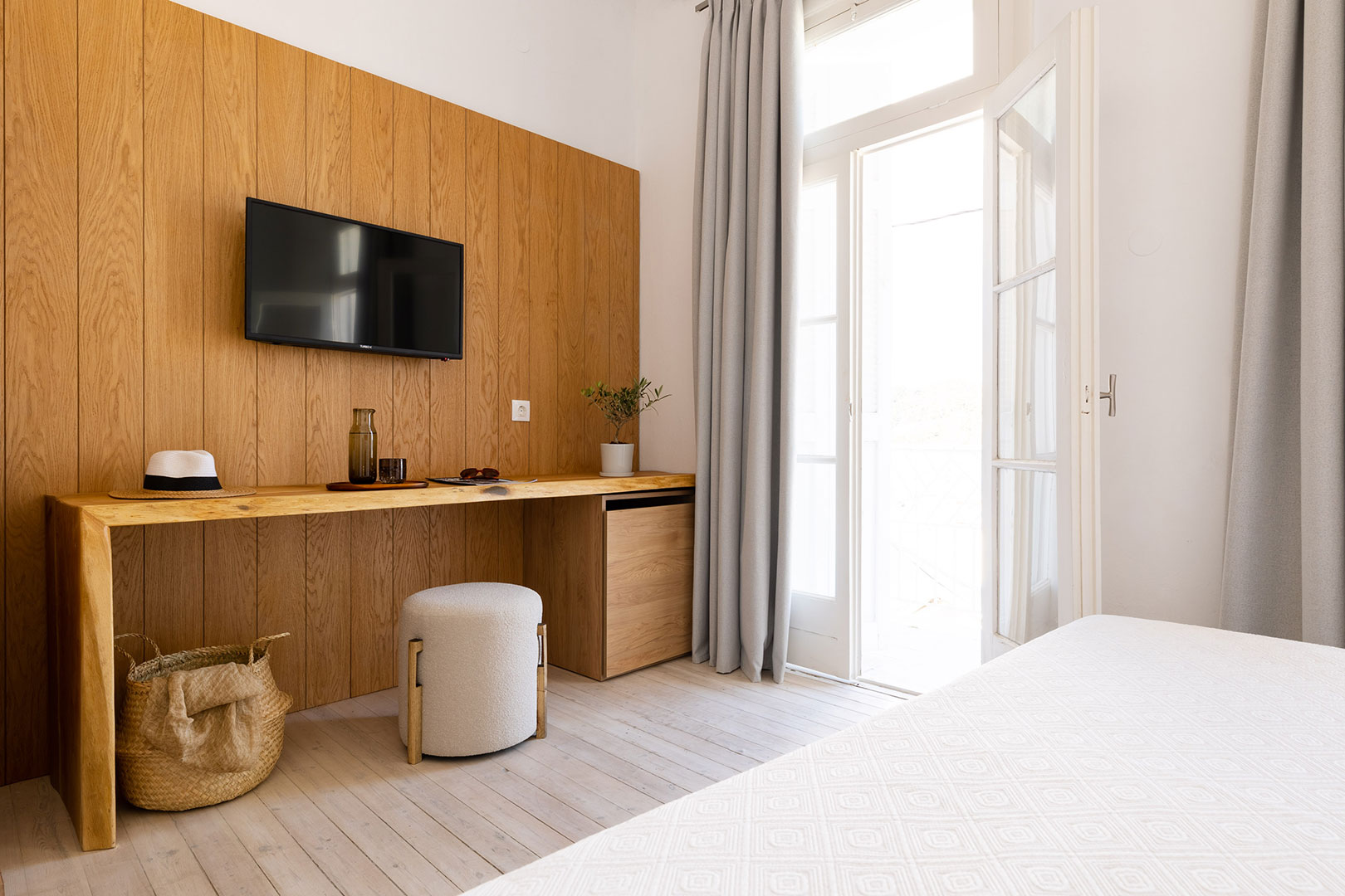Λουσμένο στο απαλό φως της ημέρας και με θέα στη λαμπερή θάλασσα, αυτό το δωμάτιο αποτυπώνει το ήρεμο πνεύμα του νησιού. Καθαρές γραμμές, διακριτικά χρώματα και αέρινη ροή δημιουργούν ένα δροσερό καταφύγιο για χαλάρωση και απόλαυση της θέας από το μπαλκόνι σας.
